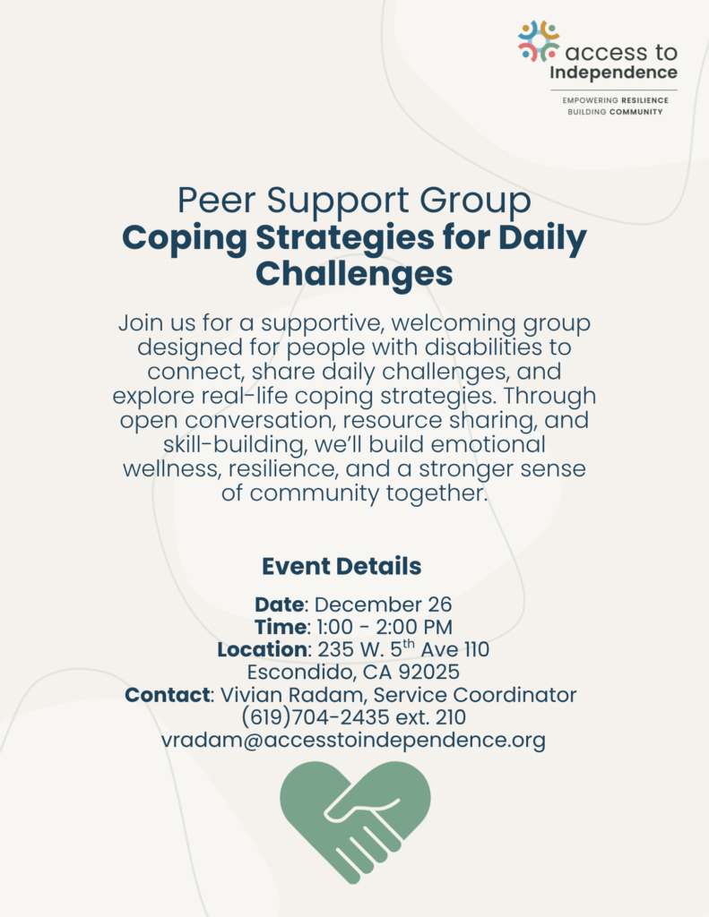 Join us for a supportive, welcoming group designed for people with disabilities to connect, share daily challenges, and explore real-life coping strategies. Through open conversation, resource sharing, and skill-building, we’ll build emotional wellness, resilience, and a stronger sense of community together.